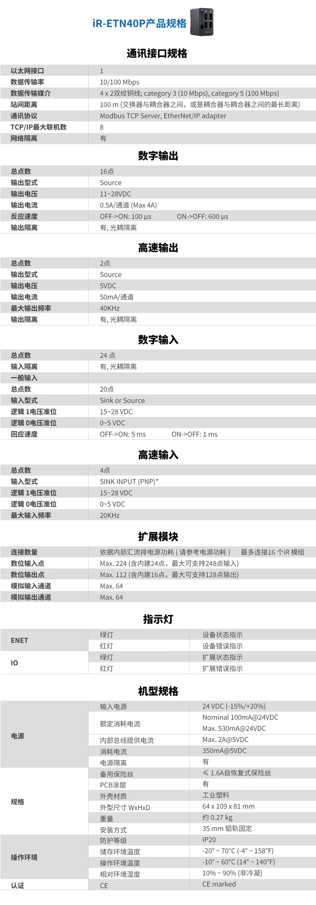 iR-ETN40P 內置MODBUS TCP/IP Server與 EtherNet/IP Adapter協議,提供24點數位輸入和16+2點數位輸出。另外,輸出、輸入點位皆使用可插拔式歐規端子臺,讓配線簡單又有效率。