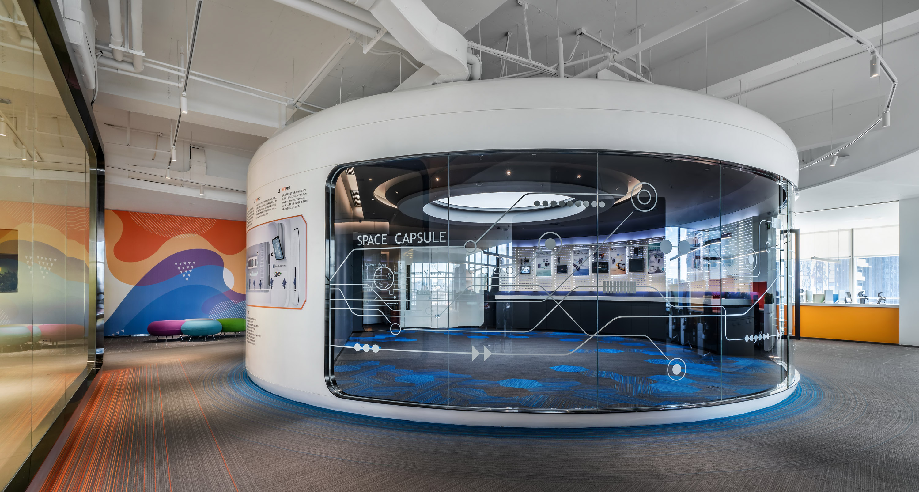將空間仿似成飛行器,賦予他們新的意義,實驗室被稱為“太空艙”,休息區稱為“知識補給站”,電話亭稱為“通訊艙”,承載著期待與夢想,飛上穿越時光的旅程。